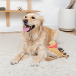 Our "Birdie" dog toy featuring exclusive artwork by Madison Safer is the perfect playdate for your pup. Made with cotton canvas, faux fur, spun recycled water bottle filling, a super loud squeaker, crazy crinkle paper, and tuggable jute rope, this playfully designed toy won't ever be a bird-en to your pup.