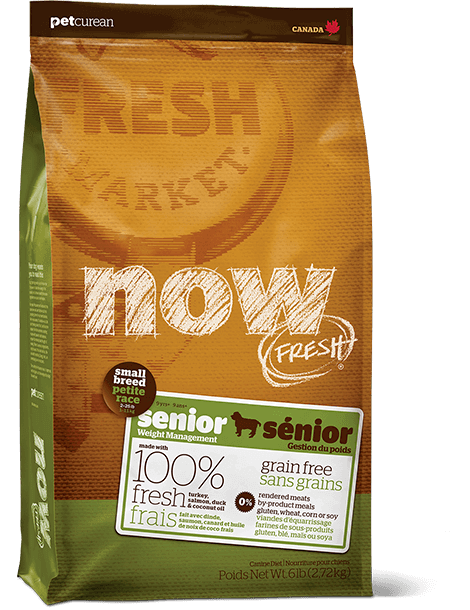 NOW FRESH™ Small Breed Senior Recipe is made with 100% FRESH turkey, salmon, duck, and 100% fresh Omega 3 & 6 oils from coconuts and canola. NOW FRESH™ also features zero grains, gluten, wheat, beef, corn or soy. Zero rendered meats, by-products or artificial preservatives.