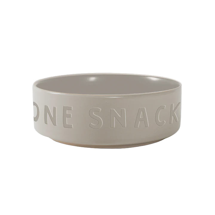 Small pet bowl with matte taupe exterior glaze, glossy taupe interior glaze, raised art, and exposed stoneware base.